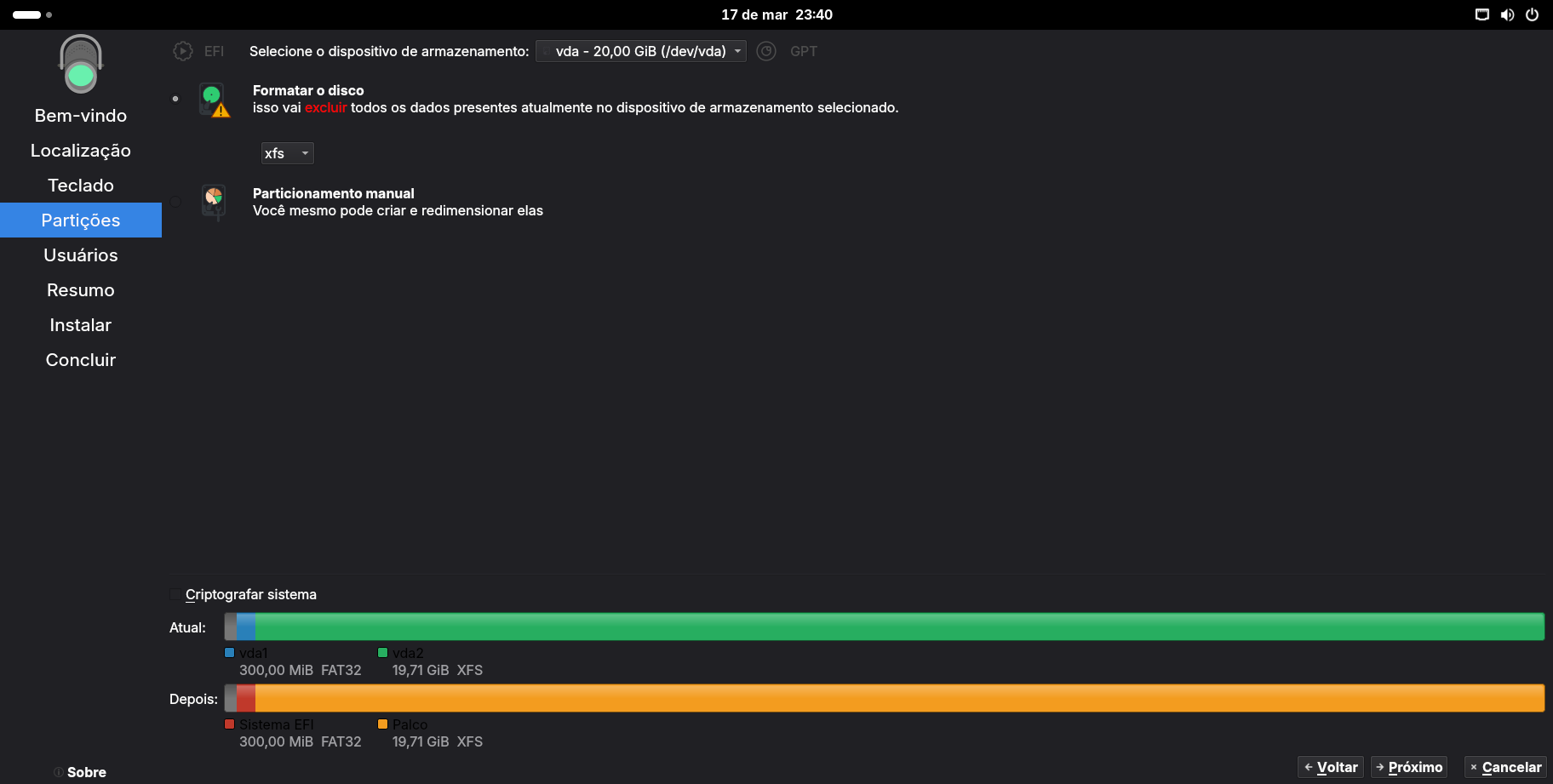 Mas, caso você queria usar o EXT4 tradicional, ele pode ser facilmente selecionado nessa etapa.