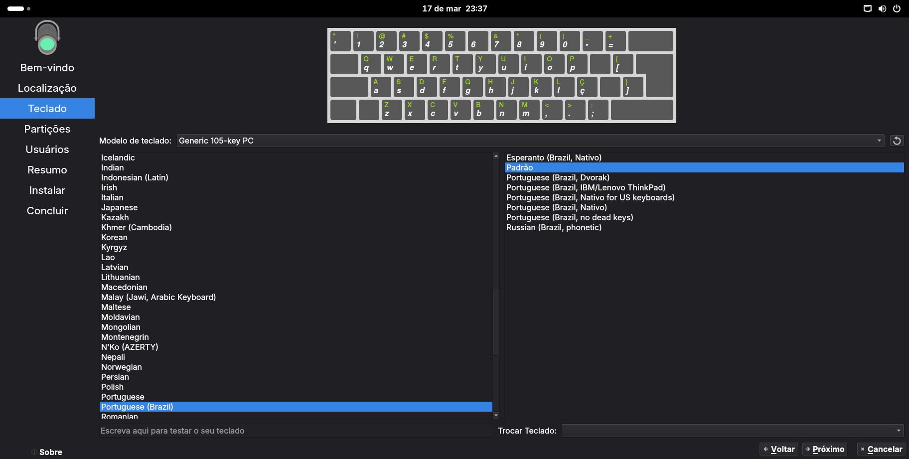 Aqui você pode selecionar o layout do teclado, caso você use um diferente do idioma selecionado ao inicializar o Calamares.